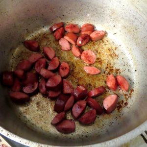 - Slice smoked sausage length ways, then in half, then cut cross ways to quarter. (In photo, mine are only in half for time sake.)Add to pot and raise heat to medium and brown lightly, stir and flip sausages.