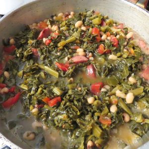 Personal Notes: The dollar store, as we call it locally, also carries one-pound packs of Eckrich smoked sausage. I buy the skinless turkey because of the granddaughters, but you may use your favorite, even andouille. Please note all the ingredients did not make it into the photo, but they ARE listed in the written recipe. As long as they are seasoned veggies, the brand does not matter. It would be quite difficult to mess up this recipe. However, I do not recommend purchasing the Glory Brand collards, because they include too much of the stem, which become too firm in the soup. Better to use two cans of seasoned mustard greens or mixed greens. Also, I cut the smoked sausage into quarters so that the smaller pieces mix better throughout the soup and easier for little children to eat.