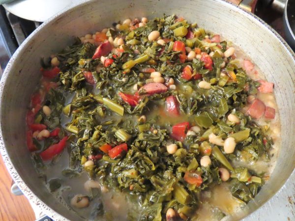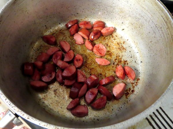 Slice smoked sausage length ways, then in half, then cut cross ways to quarter. (In photo, mine are only in half for time sake.)Add to pot and raise heat to medium and brown lightly, stir and flip sausages.